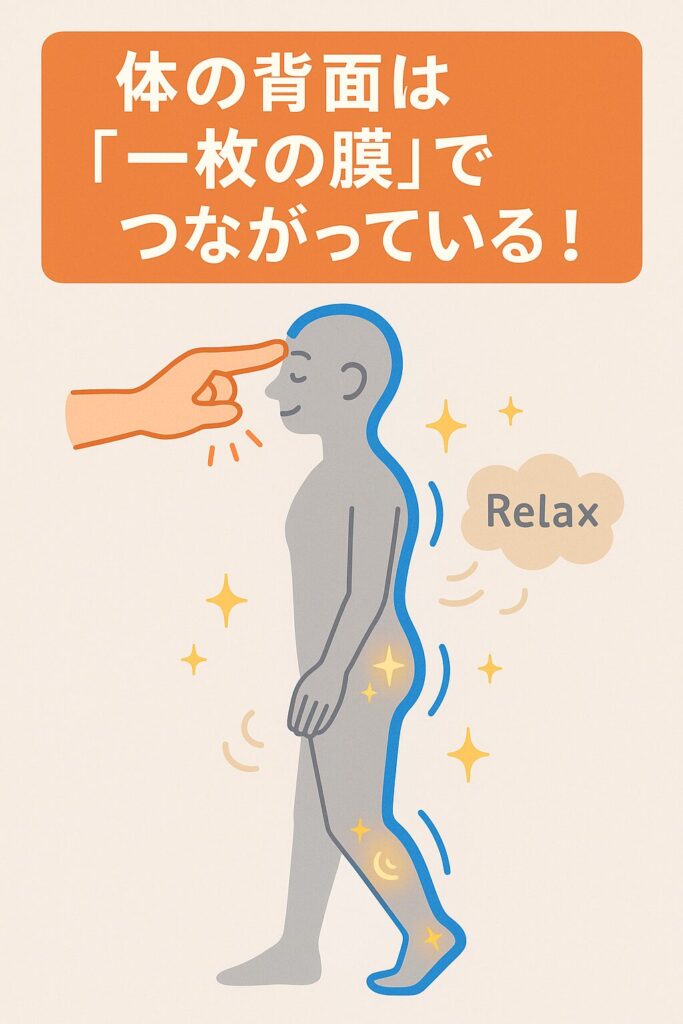 想像してみてください。あなたがピチピチの全身タイツを着ているとします。もし、背中の生地がパツパツに張って前屈できない時、無理やり背中を引っ張るよりも、タイツの端っこである「おでこ」や「足裏」の生地を少し緩めてあげた方が、全体に余裕が生まれて動きやすくなりますよね?