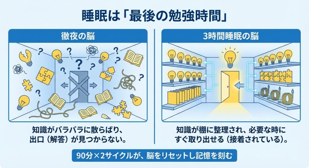 「3時間寝る」という選択は、決して逃げではありません。むしろ、3時間睡眠は、短期記憶を長期記憶へと移行させる「接着剤」の役割を果たす、最も効率的な学習プロセスです。