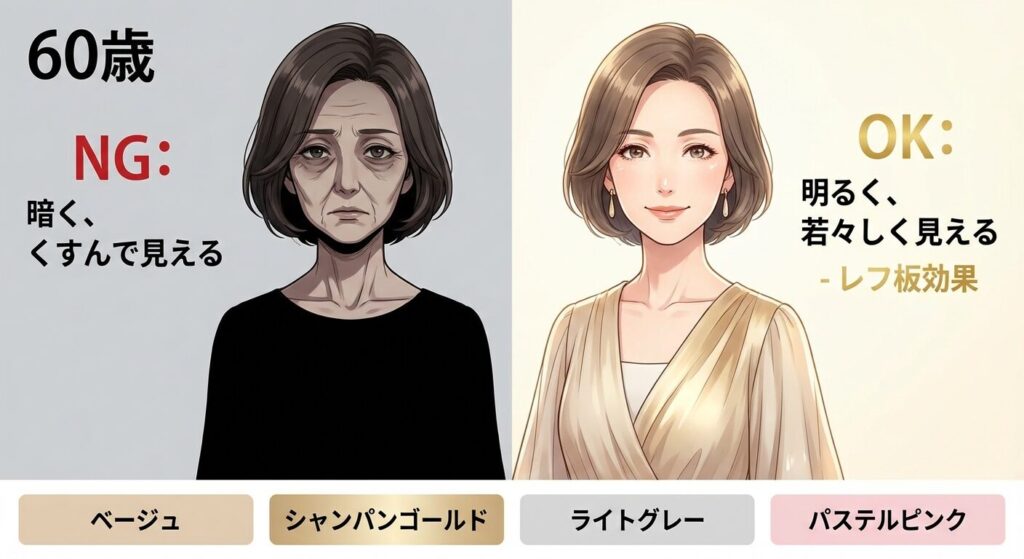 加齢によって肌のトーンが下がると、暗い色の服は顔色をさらに沈ませ、シワや影を目立たせてしまうからです。