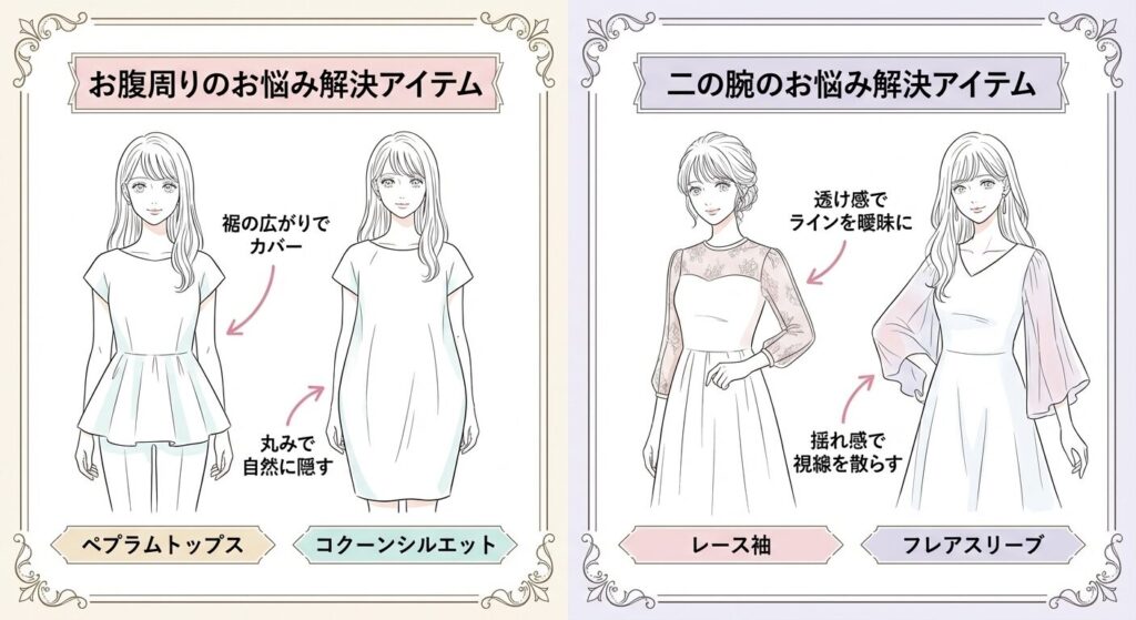 お腹や二の腕は、布で覆い隠すのではなく、立体的なデザインで「曖昧にする」のが正解です。