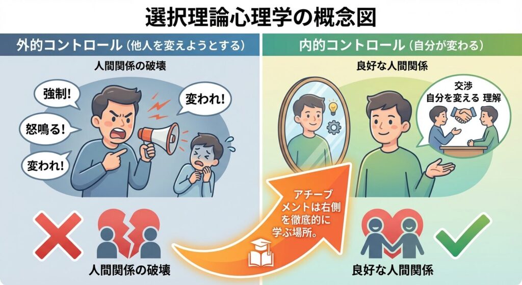 アチーブメントが「宗教的」と誤解される最大の理由は、そのカリキュラムの根幹にある「選択理論心理学」と、それによって形成されるコミュニティの性質にあります。