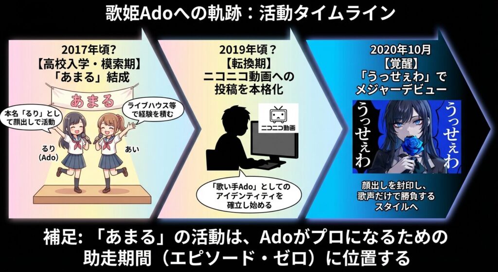 ここで重要なのは、これらの活動時期とAdoとしてのデビュー時期の関係性です。