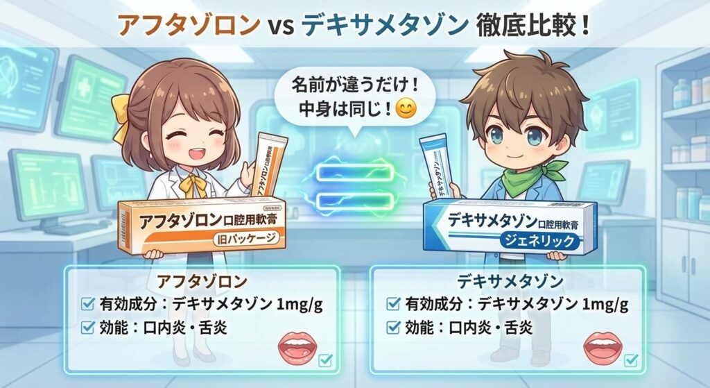 アフタゾロンの有効成分は「デキサメタゾン」でした。このジェネリック医薬品は、有効成分の量も、効能・効果(難治性口内炎や舌炎への適応)も、アフタゾロンと全く同じです。使い心地もほとんど変わりません。
