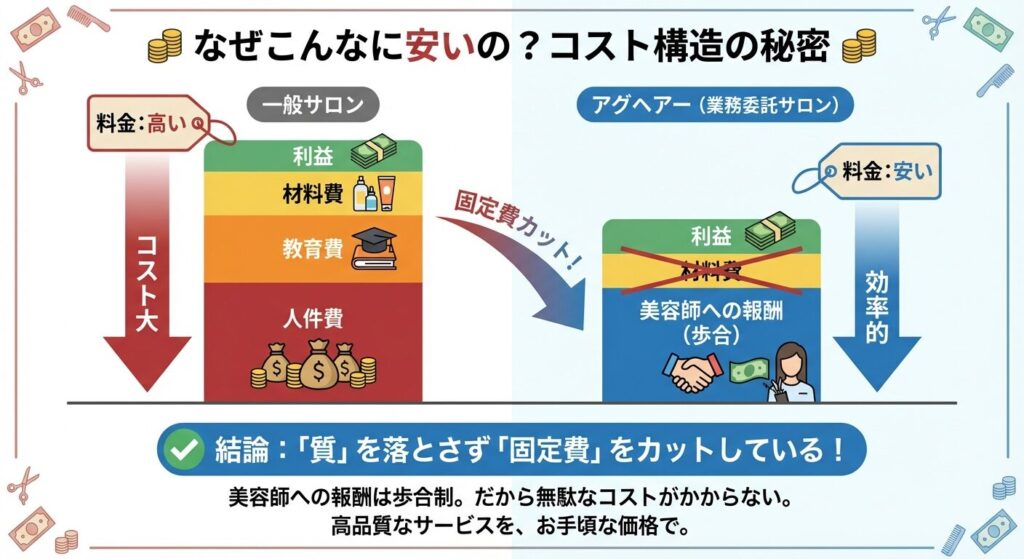 「安さには裏がある」。そう疑うのは賢い消費者の証です。しかし、アグヘアーの安さに「怪しい裏」はありません。あるのは、徹底的に計算された「企業努力」「仕組み」だけです。