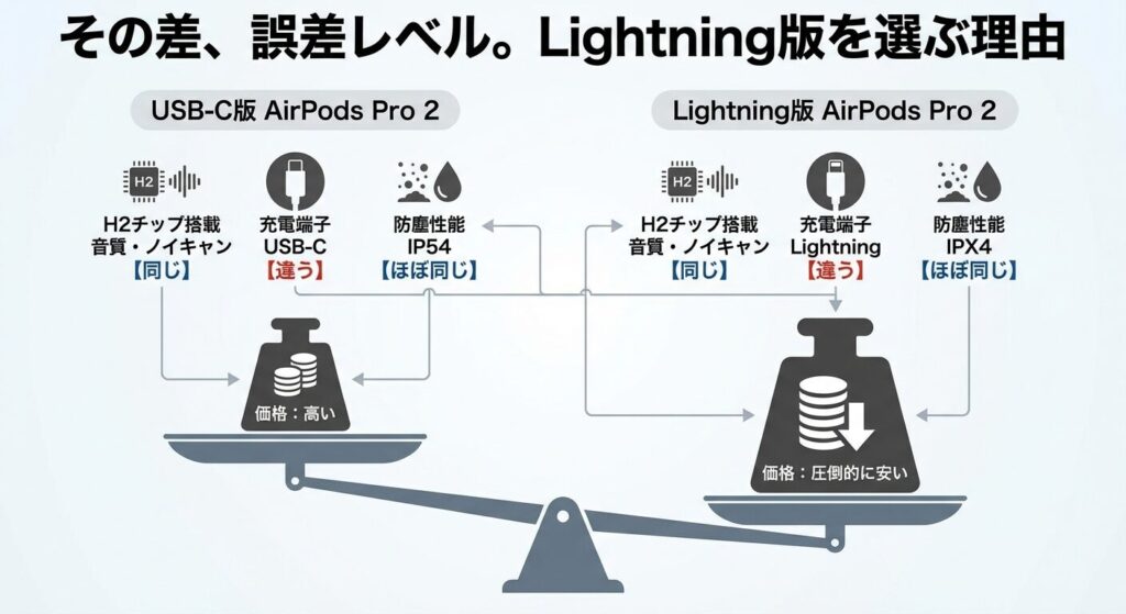 AirPods Pro 2には、2022年発売の「Lightning版」と、2023年発売の「USB-C版」の2種類が存在します。市場ではUSB-C版が最新モデルとして扱われていますが、実はこの二つ、機能的な代替性が非常に高く、体験価値にほとんど差がありません。