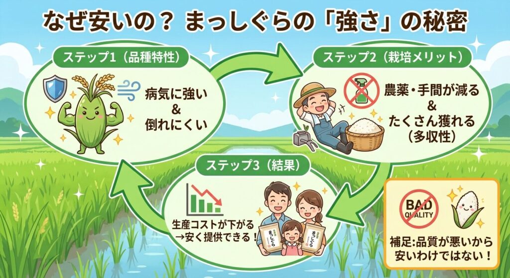 - 安さの理由: 多収性と耐病性による生産コストの削減。