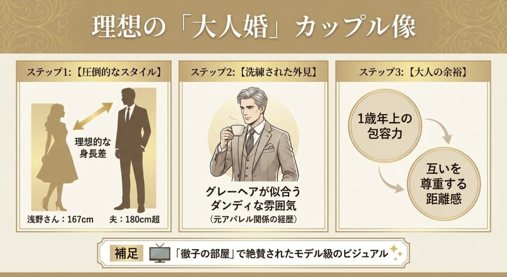また、夫のビジュアルを象徴するのが、美しく整えられた「グレーヘア」です。若作りに走るのではなく、年齢を重ねたからこそ出せる渋みと清潔感を兼ね備えたその姿は、視聴者から「ダンディすぎる」と絶賛されました。元々アパレル関係の仕事に携わっていた経歴があるとのことで、ファッションセンスも抜群。浅野ゆう子さんの華やかな存在感に引けを取らない、確かな風格を感じさせます。