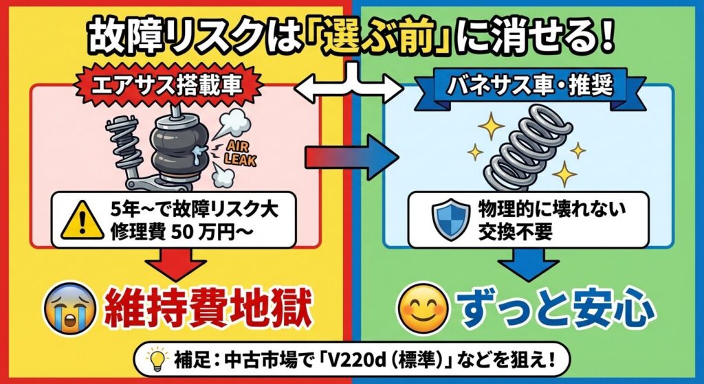 「乗り心地が悪くなるのでは?」と心配されるかもしれませんが、前述の通りVクラスのボディ剛性は極めて高いため、バネサスでも十分に快適です。いつ壊れるか怯えながら乗るより、精神衛生上も財布にも、バネサスモデル(V220dの標準ボディなど)を指名買いするのが、賢いパパの戦略です。
