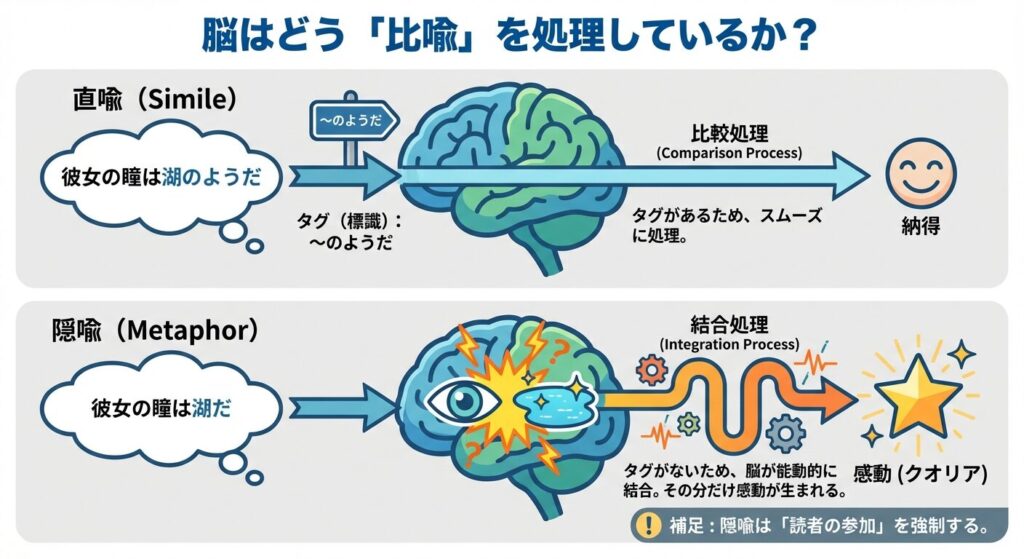 「比喩標識」がないことで発生するこの能動的な「謎解き(意味の結合)」のプロセスこそが、読者の脳内に強い「クオリア(質感)」を生み出します。