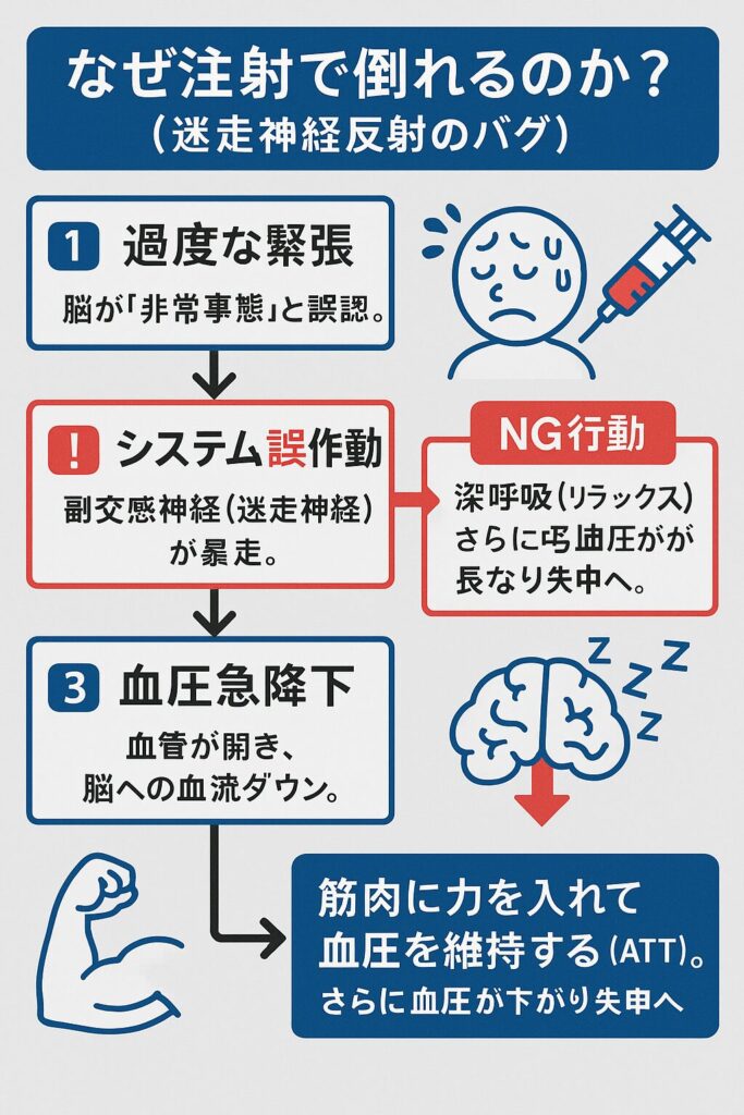 通常、人はストレス(注射の痛みや恐怖)を感じると、交感神経が活発になり血圧が上がります。しかし、過度な恐怖や緊張がピークに達すると、脳は誤って「休息モード」である副交感神経(迷走神経)を急激に活性化させてしまいます。