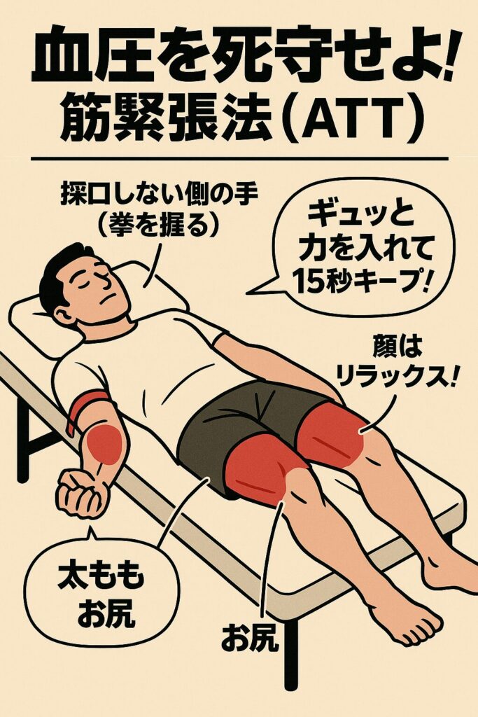 いざ採血室に入ったら、あなたのミッションは「脳への血流を維持すること」に集中することです。