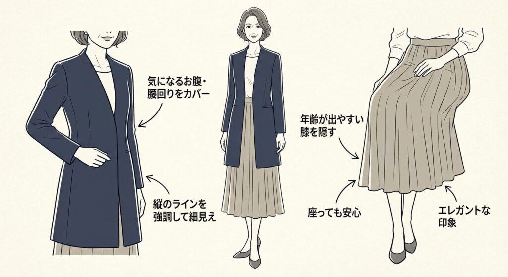 この組み合わせなら、気になる部分を自然にカバーしつつ、縦のラインが強調されてスタイルアップ効果も抜群です。