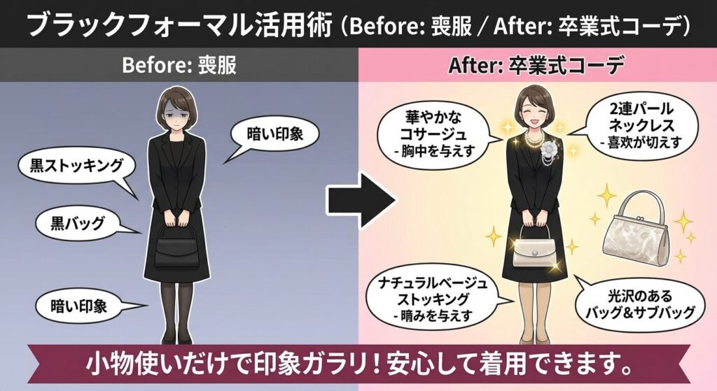 ただし、そのまま着ていくのは絶対にNG。「喪」のイメージを払拭し、「祝」の装いに変える工夫が必要です。