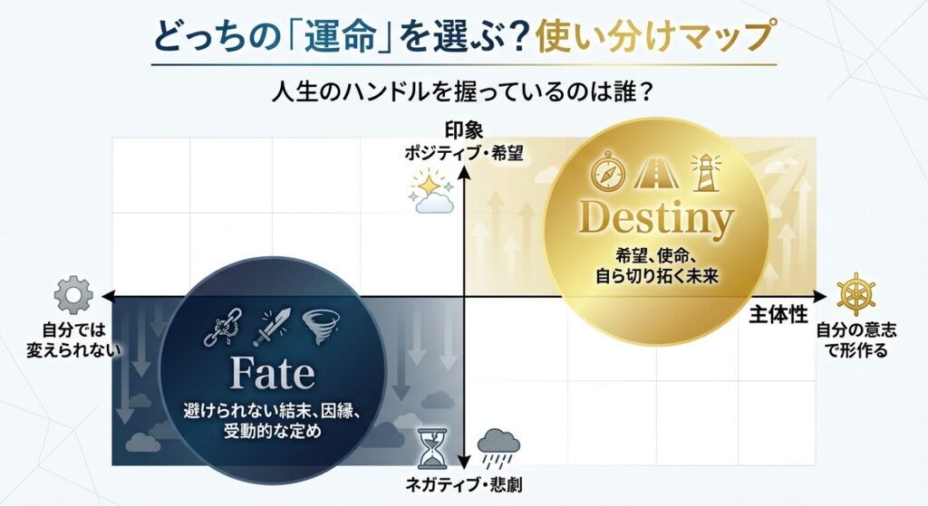 核心にあるのは、「その出来事に、あなたの意志(主体性)が介在しているかどうか」という点です。日本語ではどちらも同じ「運命」という箱に入れられてしまいますが、ネイティブの頭の中では、この2つは全く別の景色として描かれています。この「心の温度差」を無視して単語を選んでしまうと、せっかくの前向きな投稿が、相手には「諦め」や「呪縛」のように聞こえてしまうこともあるのです。