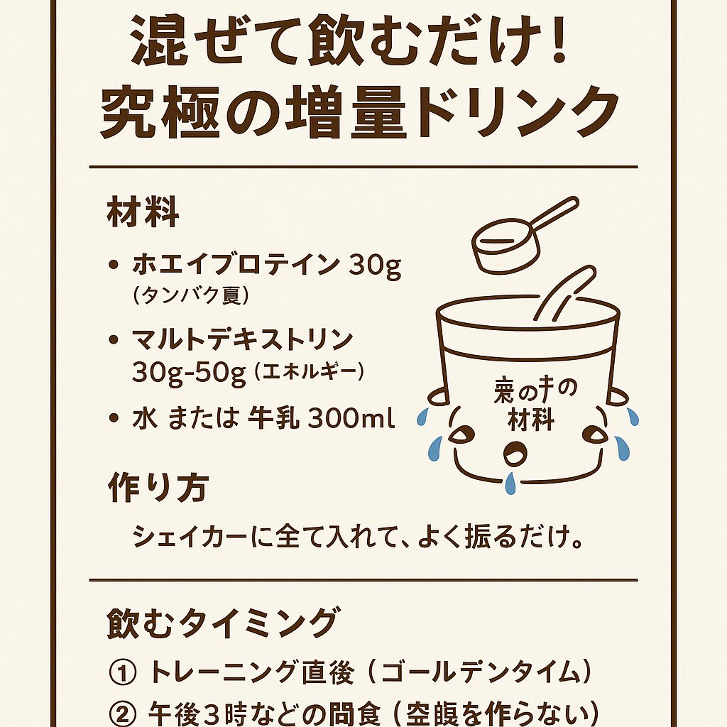 【結論】: プロテインを飲むときは、必ず同量の「マルトデキストリン」を混ぜて飲んでください。
