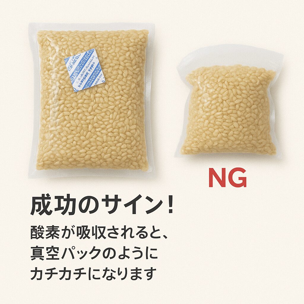 | 脱酸素剤 (例:エージレスなど) | 袋の中の酸素を吸収し、無酸素状態にする。 | 開封するとすぐに酸素吸収が始まるため、手早く作業する。 |