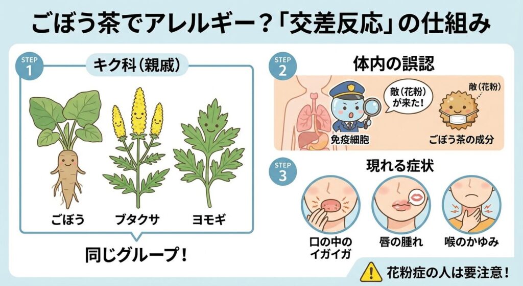 これらの植物は、アレルギーの原因となるタンパク質の構造が非常によく似ています。そのため、体が「あ、これは花粉だ!」と勘違いしてしまい、お茶として飲んだ場合でもアレルギー反応を引き起こすことがあるのです。これを口腔アレルギー症候群(OAS)と呼びます。