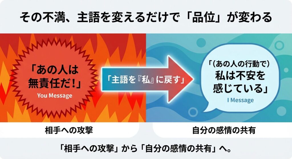 一方で、「上司のあの言い方に、私は悲しくなった」「急な変更で、私は困惑している」という伝え方は、主語が自分(I)です。これは自分の内面で起きた感情を伝えているだけであり、相手を攻撃してはいません。これが「Iメッセージ」による「健全な愚痴」です。