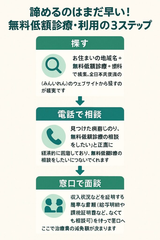 【結論】: 電話をかける際は「歯が痛くて、お金に困っている」という事実だけを、ありのまま伝えてください。