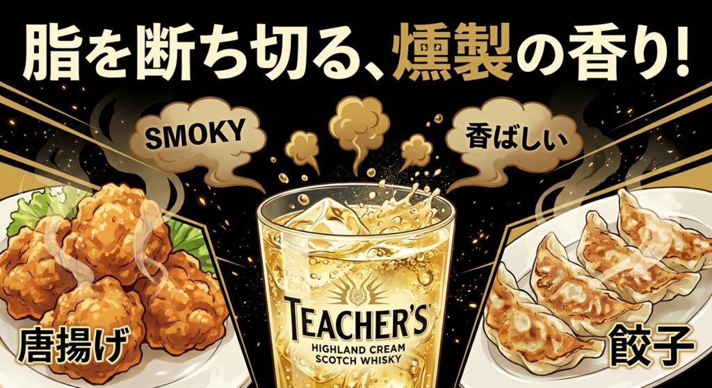 唐揚げや餃子を食べた後、ティーチャーズのハイボールを流し込むと、口の中の油をスモーキーな香りがスパッと切ってくれます。この快感は、角瓶では味わえません。まさに「食卓の最強サポーター」です。