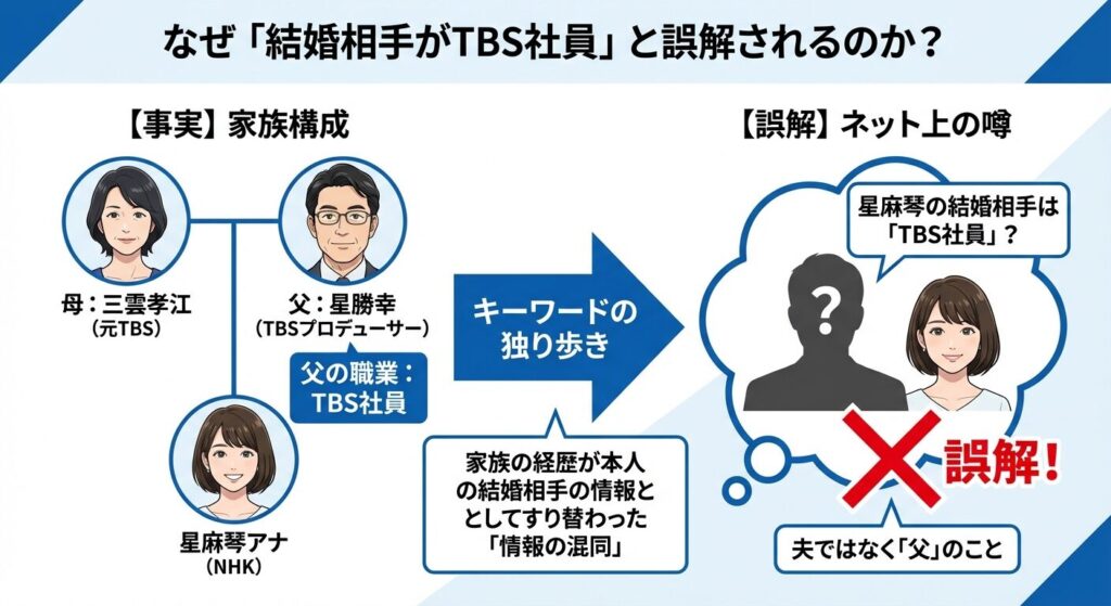 つまり、ネット上で囁かれている「TBS社員」という情報は、星麻琴アナウンサーの結婚相手のことではなく、星麻琴アナウンサーの父親である星勝幸氏の職業が混同されて広まったものなのです。