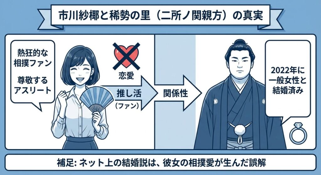 この噂が広まった背景には、市川紗椰さんの熱狂的な「相撲愛」があります。彼女は好角家(相撲ファン)として知られ、稀勢の里さんを「推し」として公言していました。その熱心な応援ぶりが、いつの間にか「結婚間近」という尾ひれのついた噂に発展してしまったのです。