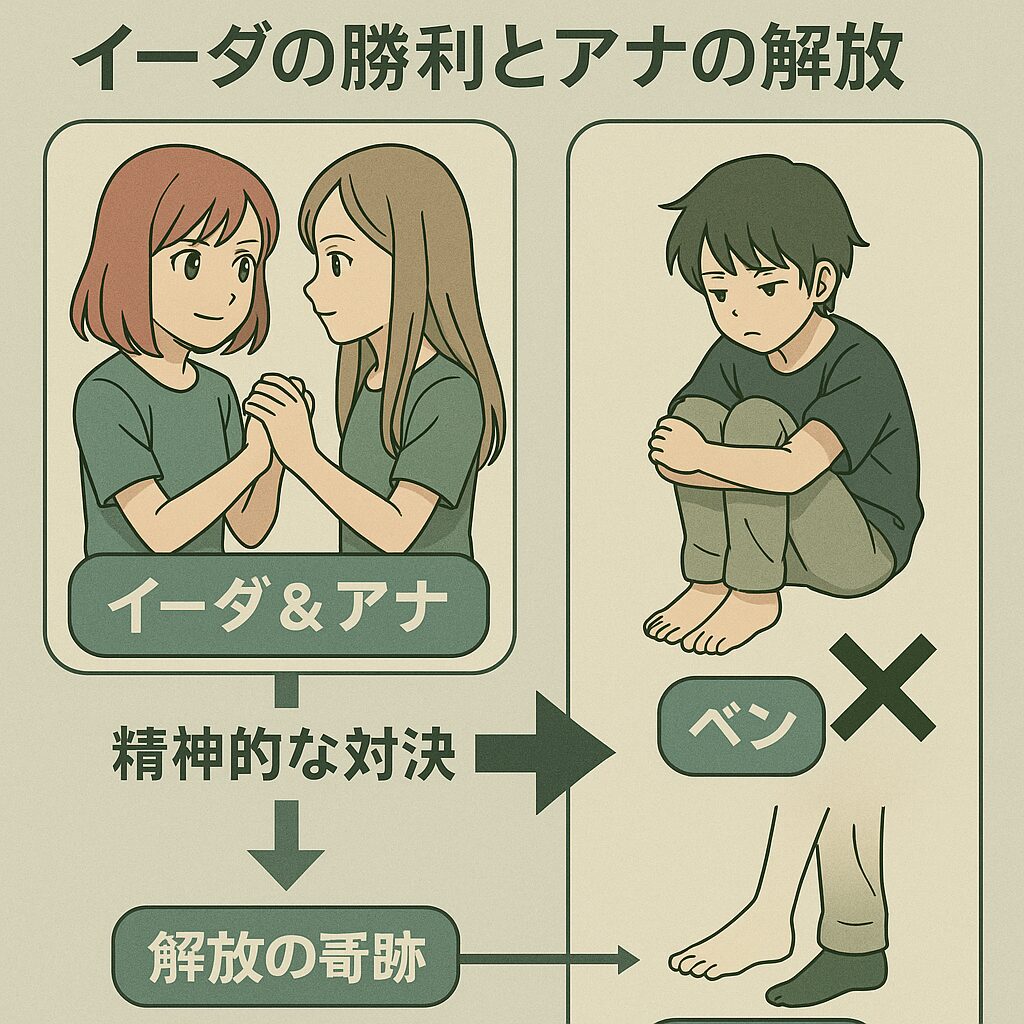 最終的にイーダは、姉を守るためにベンと対決することを選びます。これは、彼女が自分の中に芽生えた善悪の基準に従って、困難に立ち向かうことを決意した瞬間であり、彼女の精神的な成長を象徴しています。
