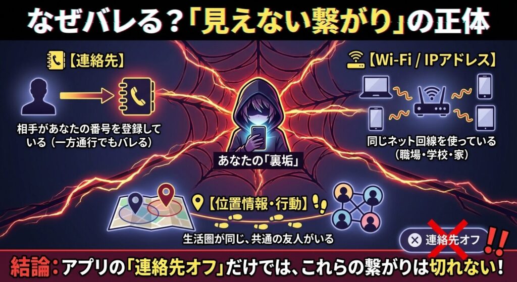 「設定で連絡先をオフにしたから大丈夫」と思っていませんか? 残念ながら、連絡先同期は身バレの原因のほんの一部に過ぎません。