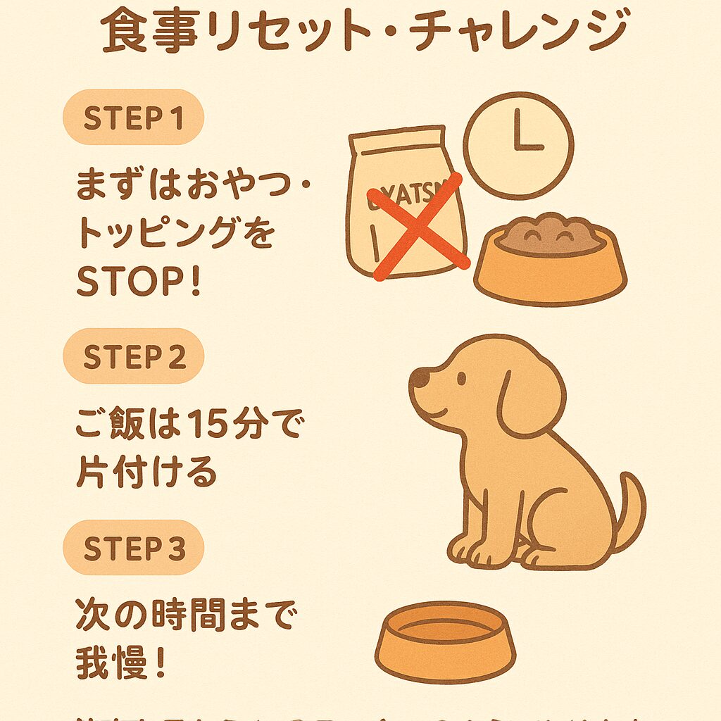 1. おやつ・トッピングを完全に中止する: まずはドライフードだけで必要な栄養を摂る、という基本に立ち返ります。
