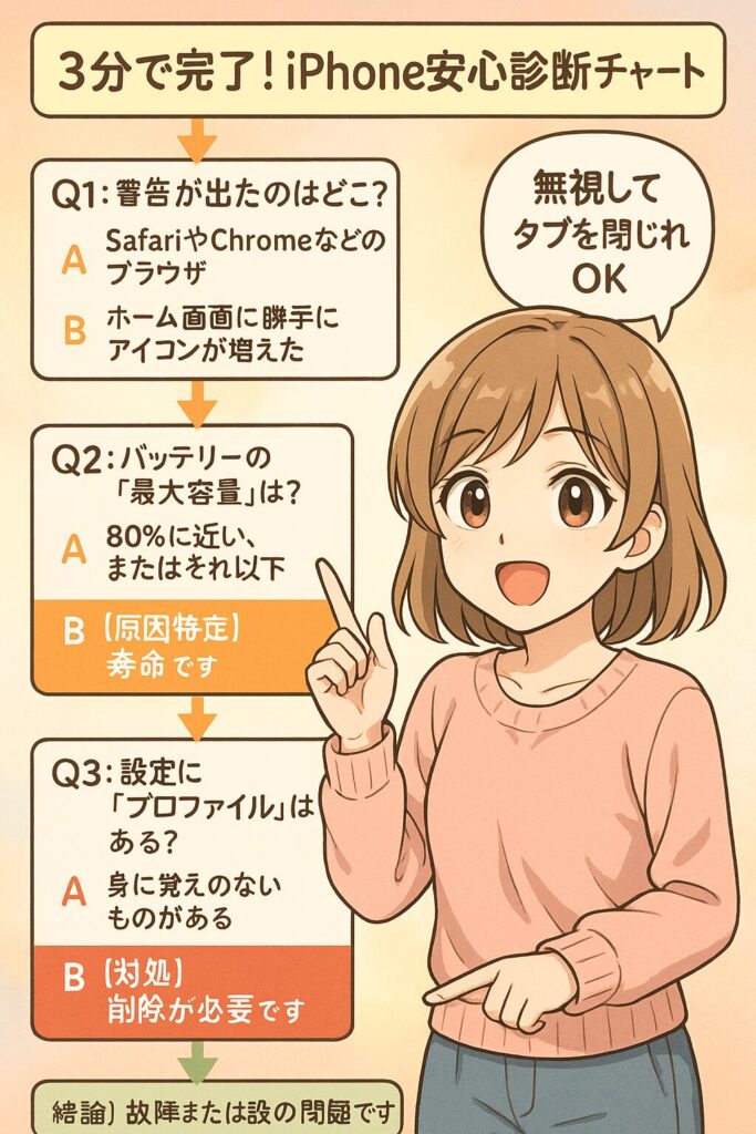 この記事では、専門用語を一切使わずに、あなたのiPhoneが安全かどうかをたった3分で確認できる「安心診断」を行います。読み終わる頃には、「なーんだ、ただの寿命だったのか」と、肩の荷が下りているはずですよ。