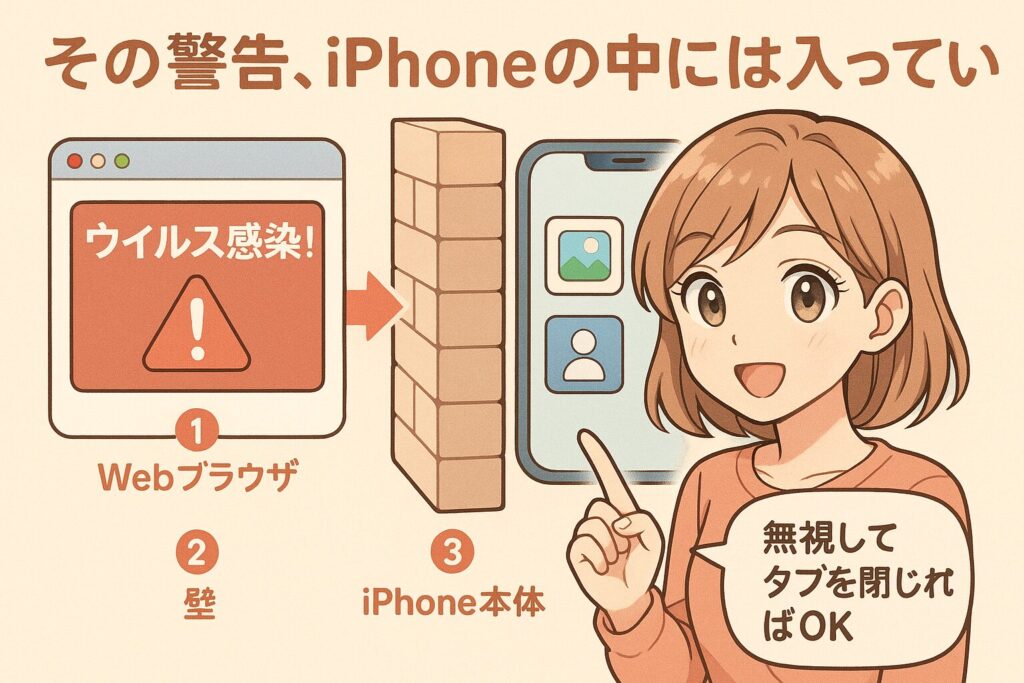 フェイクアラートは、あなたを驚かせて、不要なアプリをダウンロードさせたり、怪しいサポートセンターに電話をかけさせたりするのが目的です。画面に表示されているだけで、あなたのiPhoneの中身(写真やパスワード)には一切触れることができません。