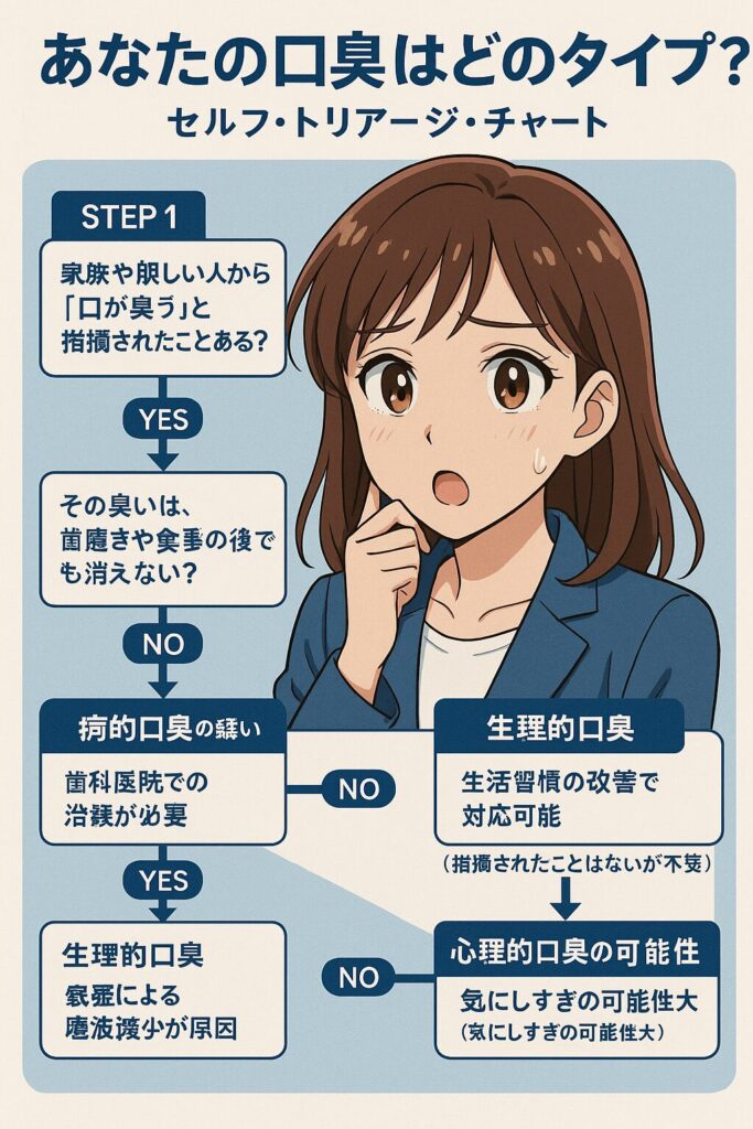 本記事は、日本口臭学会のガイドラインおよび最新の歯学知見に基づき、歯科医師による監修を経て作成されています。口臭の診断や治療に関しては、必ず専門の医療機関を受診してください。
