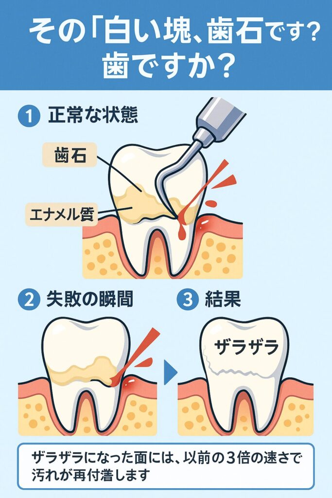 多くのチャレンジャーが「やった!白い塊が取れた!」と喜びますが、実はそれが歯の表面を守る「エナメル質」そのものだったというケースが後を絶ちません。セルフスケーリングは、歯石を除去するどころか、エナメル質を破壊・損傷させる行為になりかねないのです。