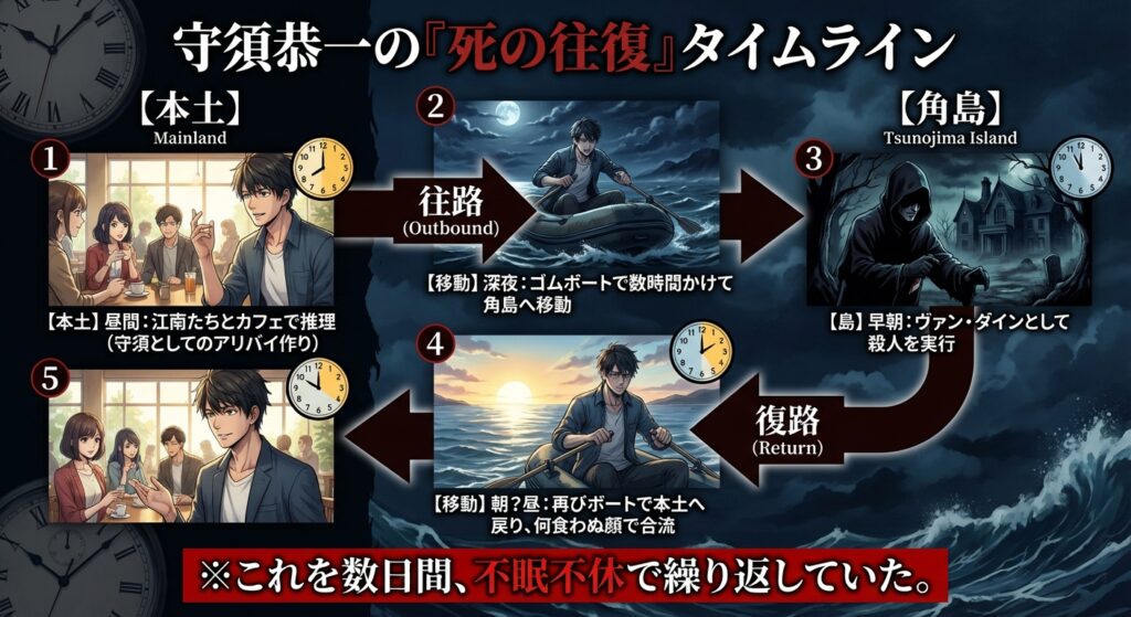 彼は、本土で江南たちと推理をしている合間を縫って、ゴムボートで島へ渡り、犯行(ヴァン・ダインとしての活動)を行っていたのです。