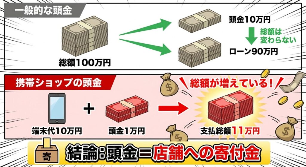 携帯ショップの頭金 = 店舗が独自に上乗せした「販売手数料(利益)」なのです。