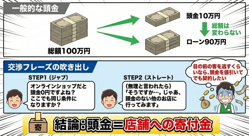 一般的なローン(住宅や車)の頭金は、「代金の一部を先に支払うこと」を指します。総額は変わりませんよね。