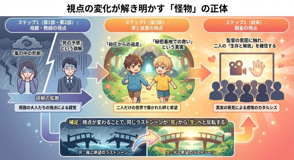 是枝裕和監督の意図と、映画『怪物』の物語構造の関係性を整理すると、この結末が「生存」でなければならない理由が明確になります。