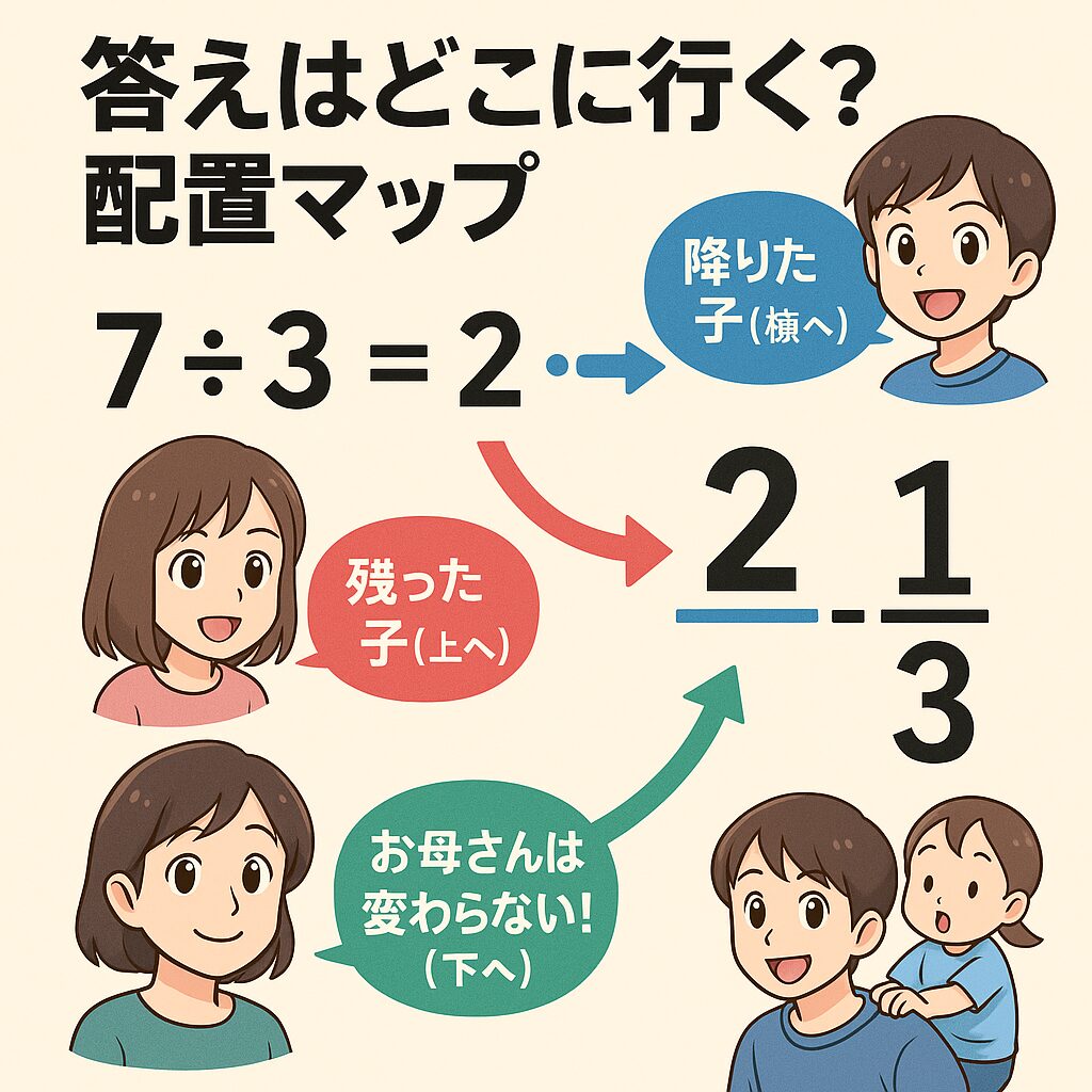 ママ: 「ねえねえ、この分数($\frac{7}{3}$)、頭が大きくてちょっと重そうだよね?」