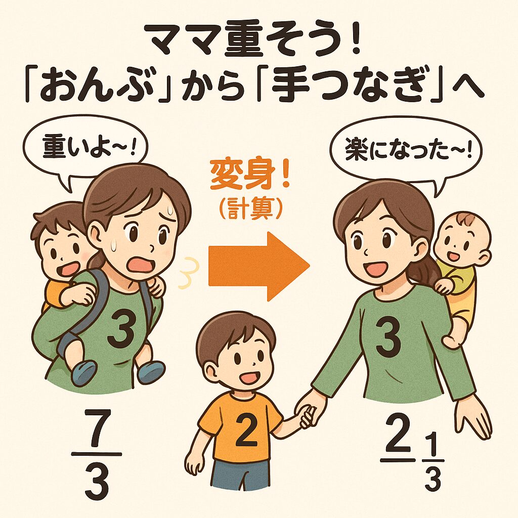 2. 帯分数($2\frac{1}{3}$など):お母さんが子供を降ろして、横に立っている状態です。「あ?、楽ちん!安定したね」というイメージです。