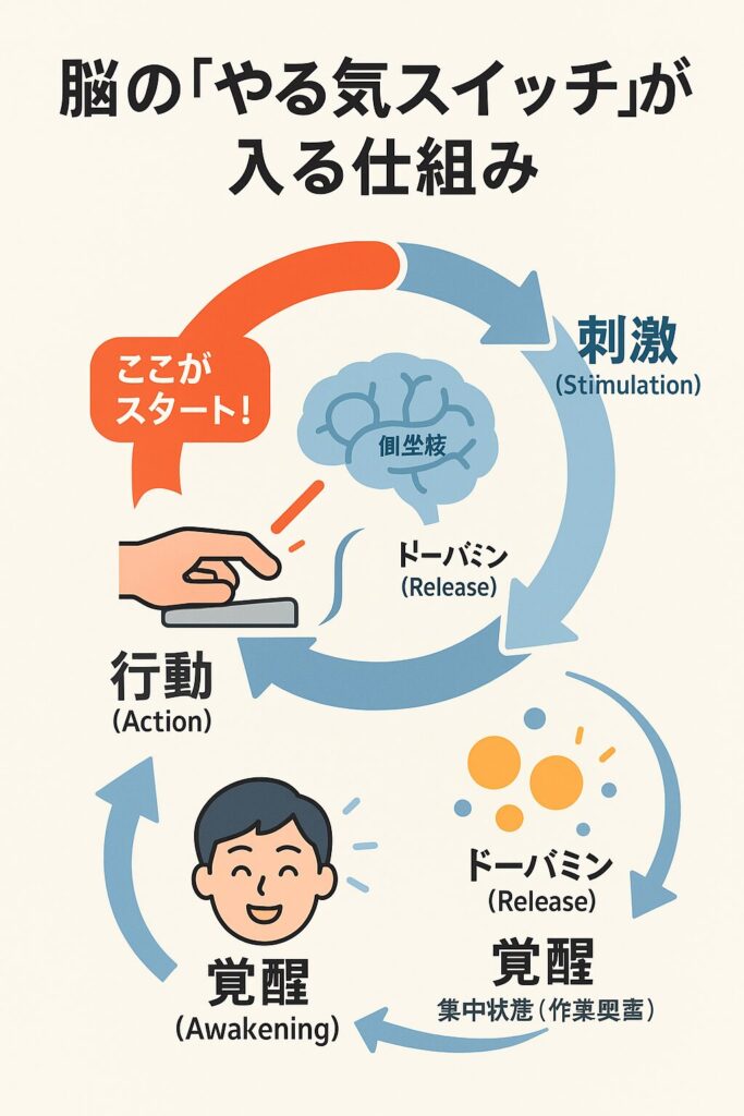 つまり、「行動」がトリガーとなり、「側坐核」が刺激され、その結果として「ドーパミン(やる気)」が出る。これが脳科学的に正しい順序です。心理学者のクレペリンが提唱したこの「作業興奮」のメカニズムこそが、私たちが利用すべき唯一のスイッチです。