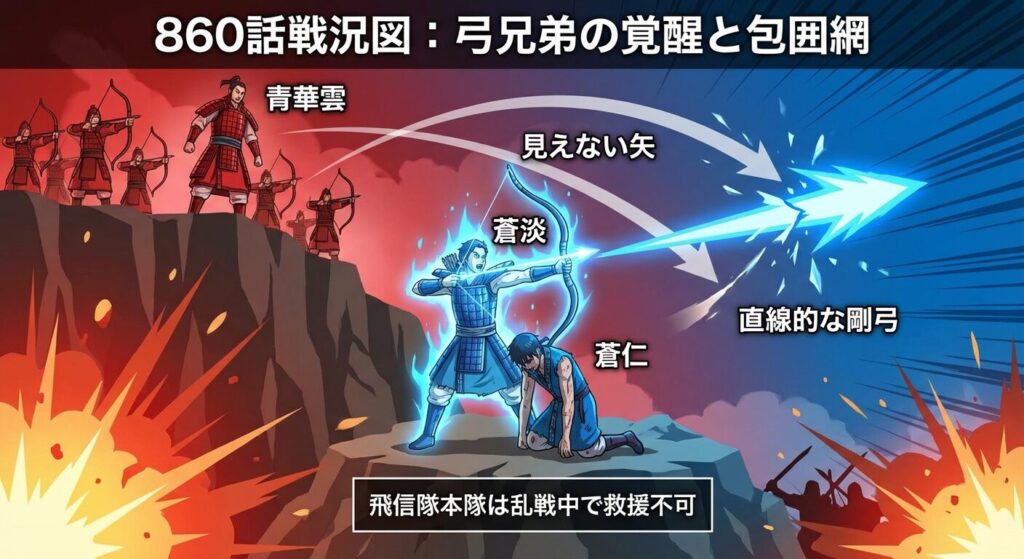 特に、青華雲が率いる弓部隊の攻撃は凄まじく、飛信隊の歩兵たちは防戦一方です。兄の仁は、弟を守るために無理をして前に出続け、青華雲の側近による狙撃で肩と足を負傷してしまいます。この仁の負傷が、結果として弟・淡の覚醒を促すことになりました。