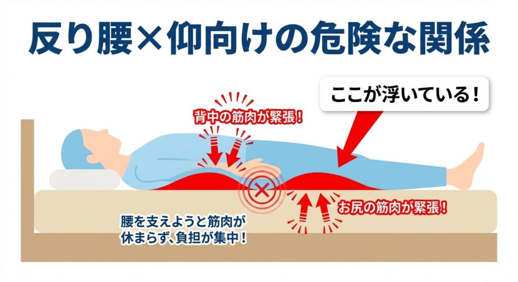 健太さんのようなデスクワーカーに多い「反り腰」の方が仰向けで寝ると、腰と布団の間に大きな隙間(ブリッジ)ができてしまいます。