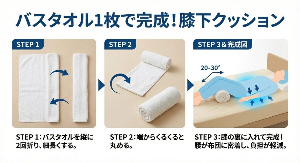 【図解】今夜から実践!バスタオルで作る「膝下クッション」完全ガイド