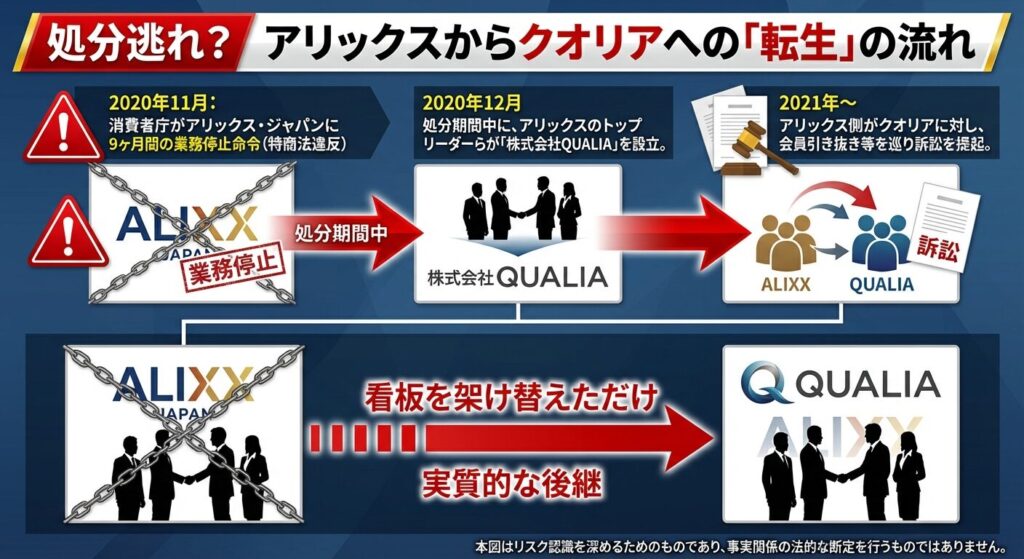 ここからが重要です。株式会社QUALIAは、このアリックスが業務停止処分を受けている最中に、同社のトップリーダーたちが会員を引き抜く形で設立されました。