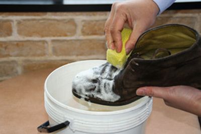靴に水を浸透させないようにしてください。少し大変ですが、スポンジを使ってシャンプーをふき取っていきます。