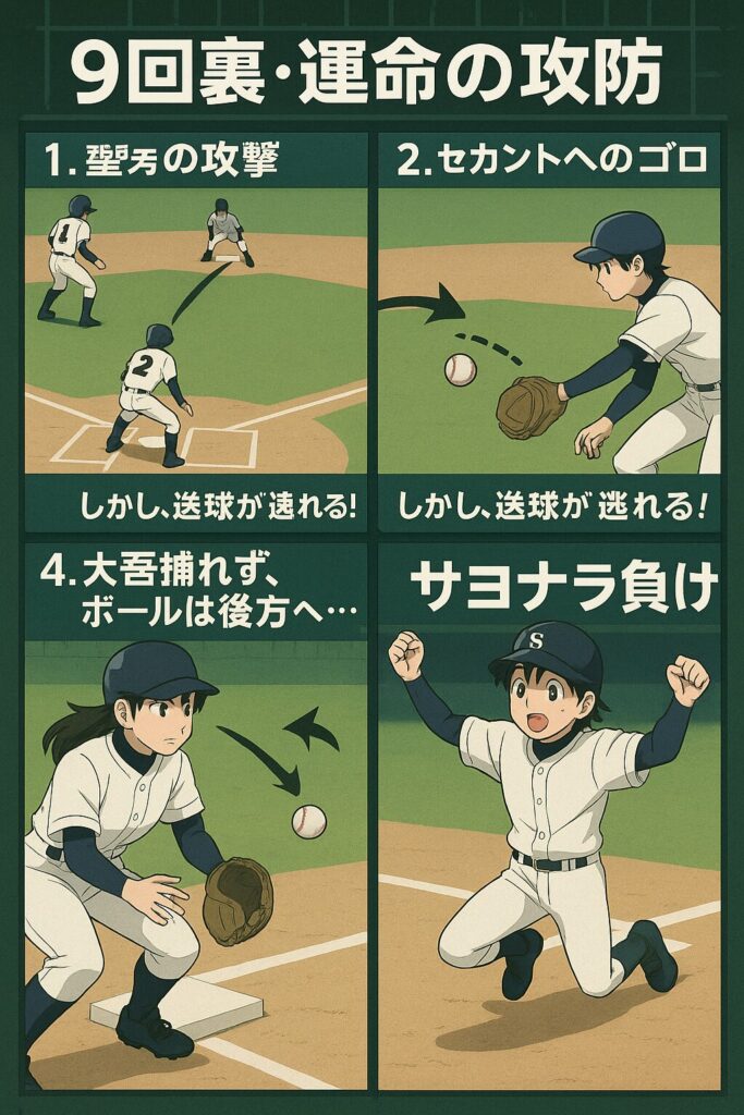 そして運命の9回裏、聖秀の攻撃。ワンアウト2塁のピンチで、打球はセカンドへ。セカンドを守る睦子がボールを捕球し、ホームへ送球します。しかし、この送球がわずかに逸れ、キャッチャーの大吾は捕球できず、ボールが転々とする間に2塁ランナーが生還。