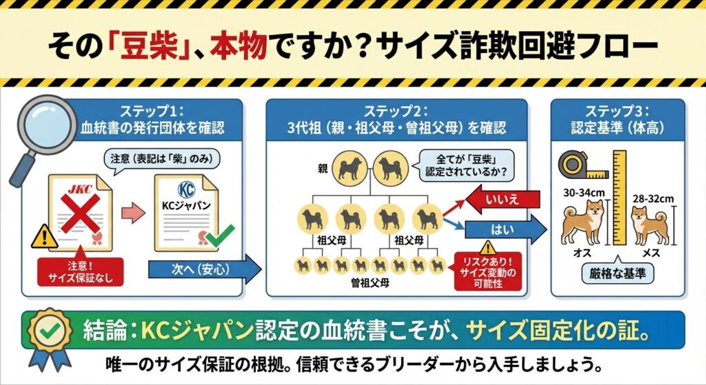 前述の通り、これが唯一のサイズ保証です。「豆柴タイプ」や「極小柴」といった曖昧な言葉に騙されず、公的な認定を確認してください。
