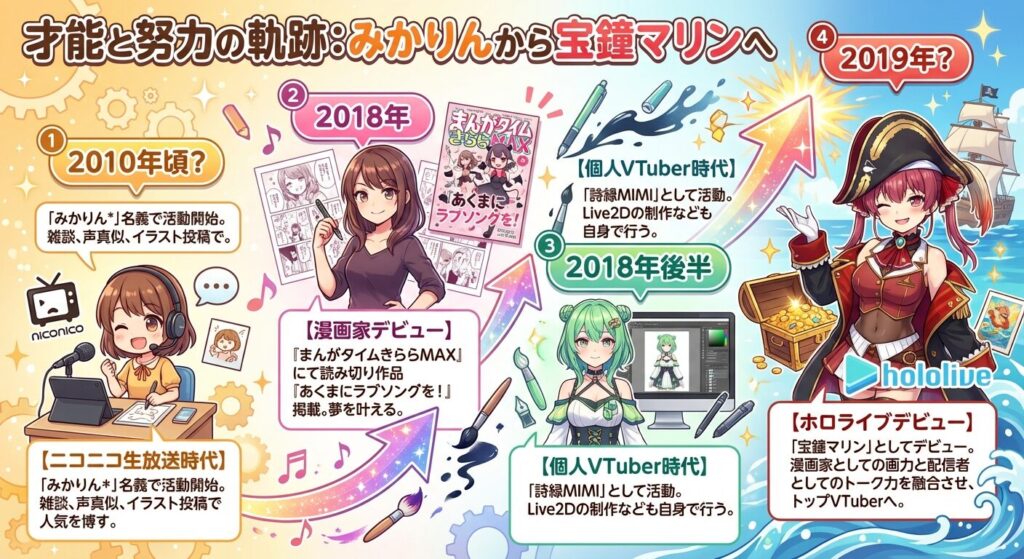 以下の図解で、彼女がどのような道を歩んで「宝鐘マリン」になったのか、そのクリエイターとしての軌跡を確認してみましょう。
