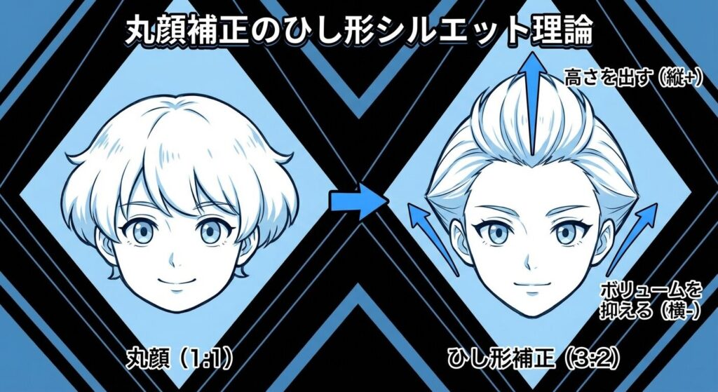 つまり、丸顔をカバーするには、「縦の長さ」を足して、「横の幅」を削ればいいのです。