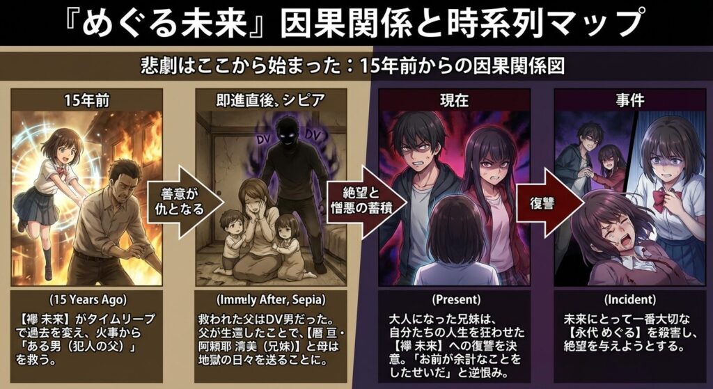 そこには、「未来の過去の善意が、亘(犯人)の人生を狂わせた」という、悲しい因果の起点が存在します。